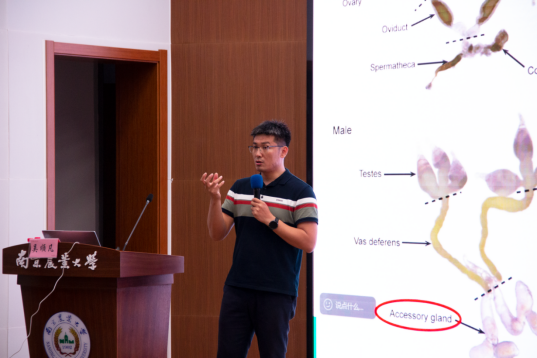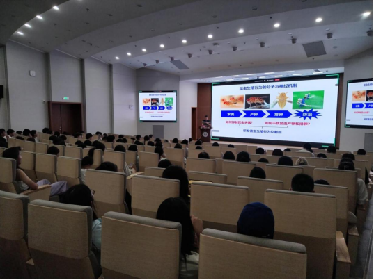 为了寻求更有效的害虫防治策略,吴顺凡教授深入讲解了“基因狙击”的创新理念。他表示,破解昆虫生殖(求偶、排卵和产卵)行为的分子与神经机制是关键所在。只有深入了解这些机制,才能精准找到害虫防控的新靶标,进而开发出新型药剂。目前,通过研发靶向昆虫生殖与性别决定相关基因的新型害虫遗传控制技术,有望实现害虫防治从传统模式向绿色革命的转变,这种技术不仅能高效控制害虫数量,还能最大程度减少对环境的负面影响。本次讲堂采用线上线下相结合的方式,吸引了众多师生参与。在互动问答环节,现场气氛热烈,同学们积极踊跃发言,提出了许多关于害虫防治技术、转基因技术等方面的问题。吴顺凡教授凭借深厚的专业知识,耐心细致地对每一个问题进行解答。针对转基因技术在社会上引发的争议,吴顺凡教授进行了专业且客观的解释。他介绍,在农业领域,转基因技术应用广泛,像常见的转基因棉花,通过转入相关基因,能够培育出具有抗病虫害能力的作物品种。这样一来,不仅可以减少农药的使用量,降低农业生产成本,还能提高作物的产量和质量,保障粮食安全。